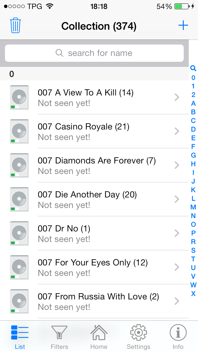 This details view will show when an item in the list is tapped or when you tap the + (add new item) button. You can see from the gray image that this depicts a DVD. You can tap an individual item to modify its contents, and than tap the save button at the top to update the complete item in the database.